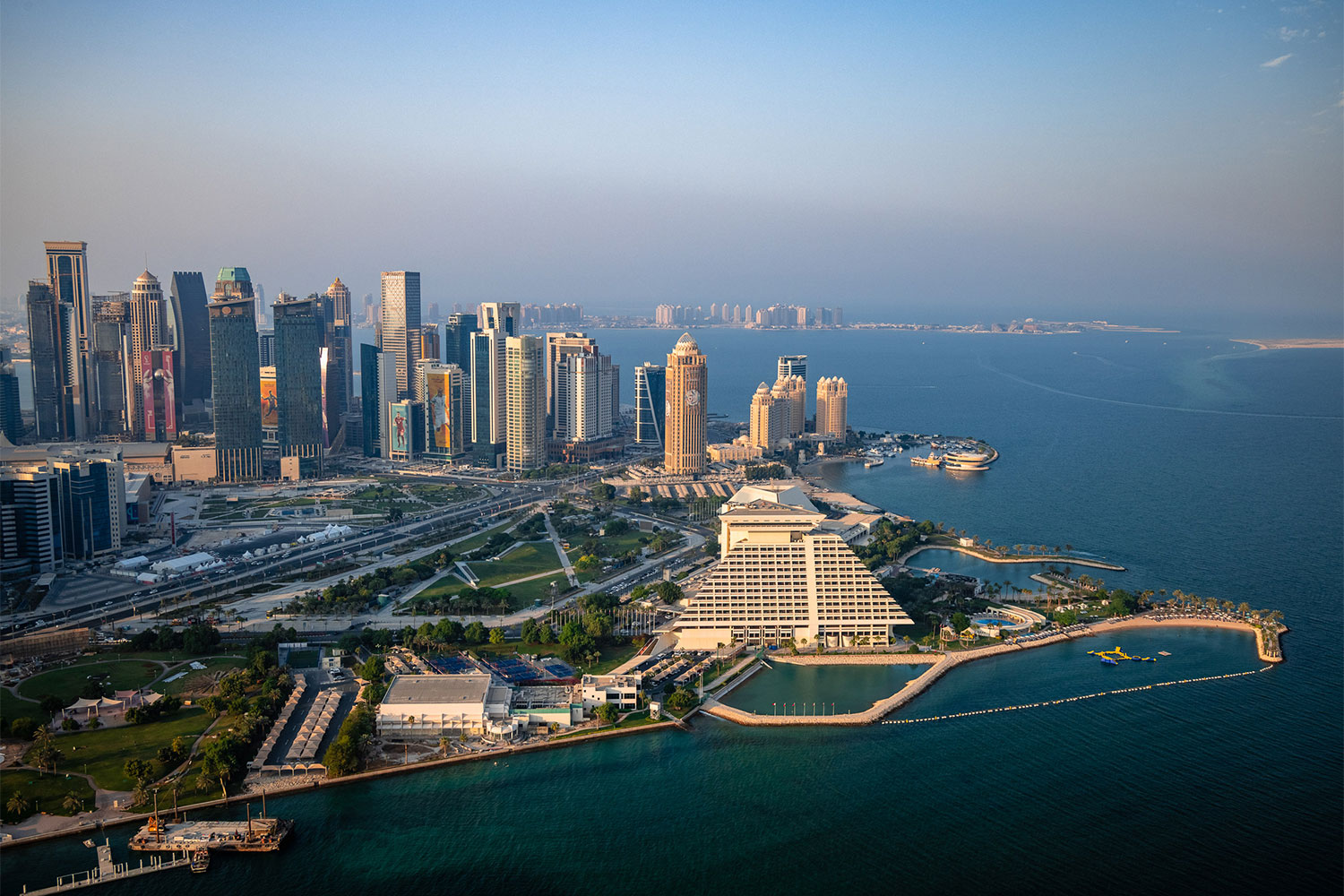 The Doha Corniche is one of the city’s most iconic landmarks, stretching seven kilometers in a graceful crescent along the Doha Bay and offering sweeping views of the city’s modern skyline. Framed by palm-lined promenades, lush parks, cultural institutions, and historic landmarks, the Corniche connects highlights such as the Sheraton Hotel Park, Al Bidda Park, the Pearl Monument, Dhow Harbour, the Museum of Islamic Art, and the National Museum of Qatar. Along the way, it brings together waterfront dining, leisure spaces, sports facilities, traditional dhow cruises, and family-friendly parks, while also serving as a focal point for national celebrations and everyday life, capturing Doha’s blend of heritage, culture, and contemporary energy.